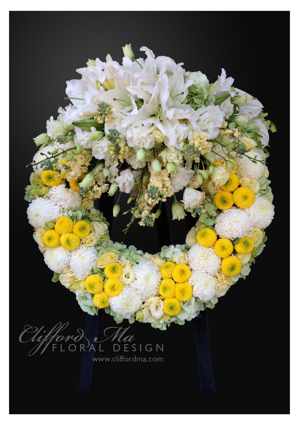 Lily w/ Chrysanthemum & Eustoma in round wooded stand